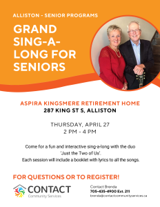 Join us on Thursday, April 27th for our Grand Sing-a-Long, featuring the musical talents of local band ‘Just the Two of Us.’